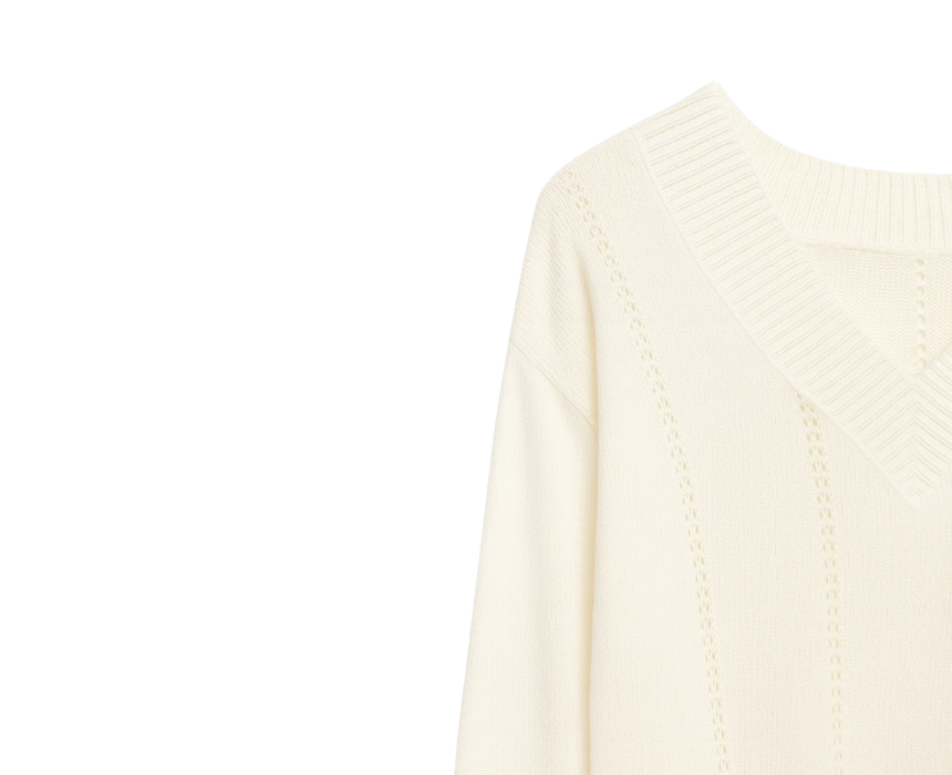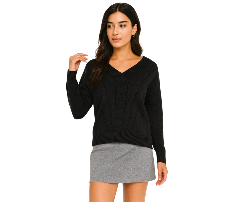 Soft and stylish V-neck sweater with vertical panel lines, lightweight and cozy for everyday wear. Available in black and white, free size.