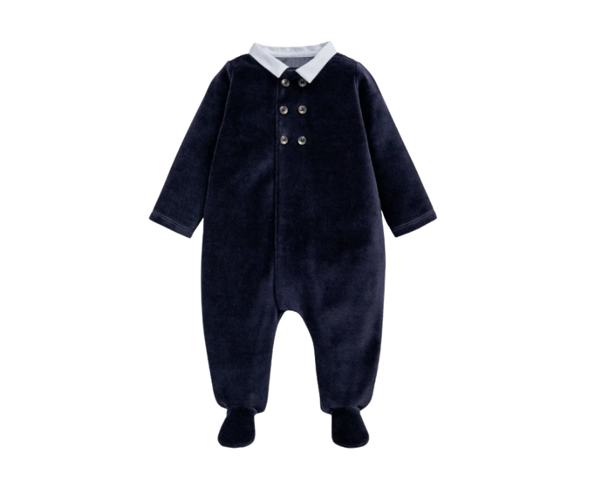 The Blue Velour Sleepsuit is a cozy and stylish all-in-one for baby boys, crafted from super-soft velour for warmth and comfort. Featuring a collared, double-breasted design with concealed front and crotch popper openings, it makes dressing easy while keeping little ones snug. Perfect for sleep or lounging, it pairs beautifully with a soft blanket for added warmth.