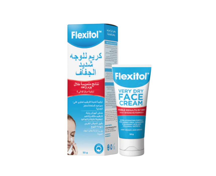 Flexitol Very Dry Face Cream 50 g is a lightweight, non-greasy moisturizer designed to deeply nourish and hydrate very dry, cracked, or sensitive skin. Its 4-in-1 formula with urea, hyaluronic acid, colloidal oatmeal, and ceramides restores moisture, soothes irritation, and strengthens the skin barrier. Apply morning and night to face and neck for soft, smooth, and comfortable skin.