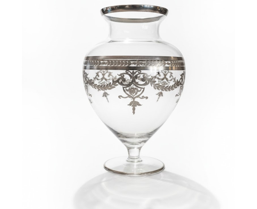 The VEVA Italian Baroque Crystal Vase features luxurious silver ornaments and elegant Baroque-style detailing, making it a sophisticated centerpiece for any refined interior. Measuring 43 × 28 cm and weighing 1 kg, this handcrafted crystal vase adds classic European charm to living rooms, dining areas, or display shelves. Ideal for collectors or lovers of timeless, decorative décor.