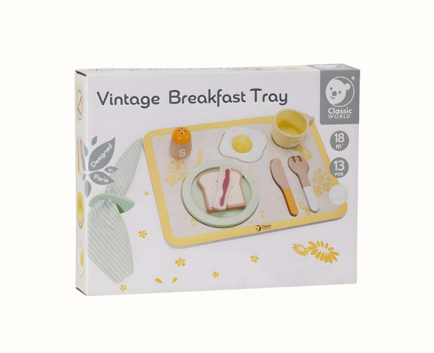 Classic World Vintage Breakfast Tray Set is suitable for ages 18 months and up and includes 13 pieces for fun and meaningful pretend play. Children can serve a healthy breakfast using the tray, toast, egg, bacon, cutlery, cup, plate, and fabric napkin, encouraging good table manners and social development. Ideal for role play at home or nursery, this set supports imagination, fine motor skills, and early life skills.