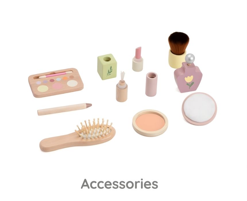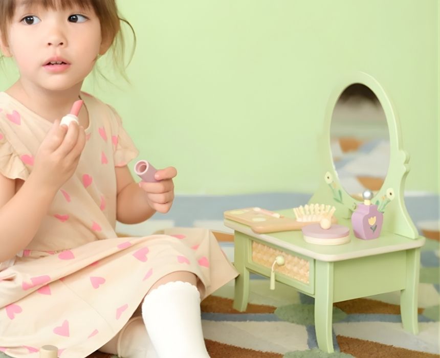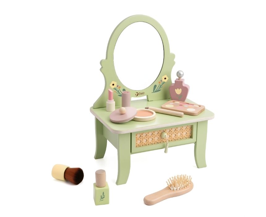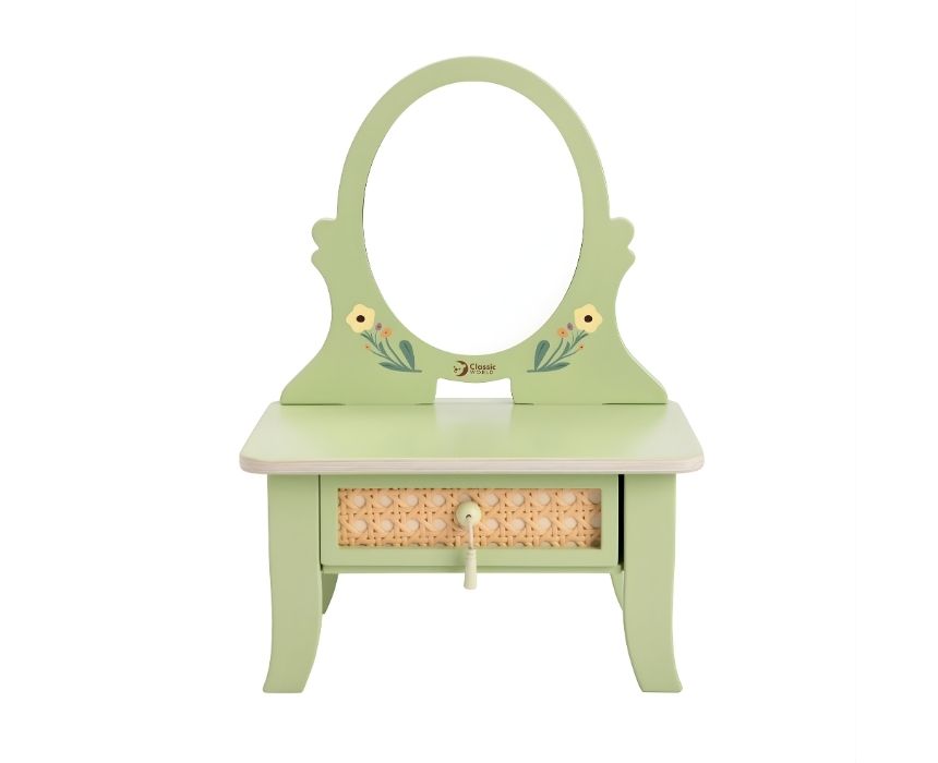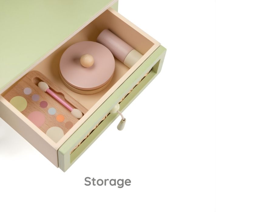 Step into a fairytale vanity with this Vintage Dresser Set, blending soft colors and natural textures for a magical beauty corner. Featuring a graceful oval mirror and a delicate rattan-style drawer, it adds a fresh touch to any play space. The set includes pretend beauty essentials like a perfume bottle, makeup brush, lipstick, powder compact, and eyeshadow palette. Crafted from child-safe materials, it nurtures creativity and fine motor skills through imaginative role-play. Perfect for ages 3 and up.