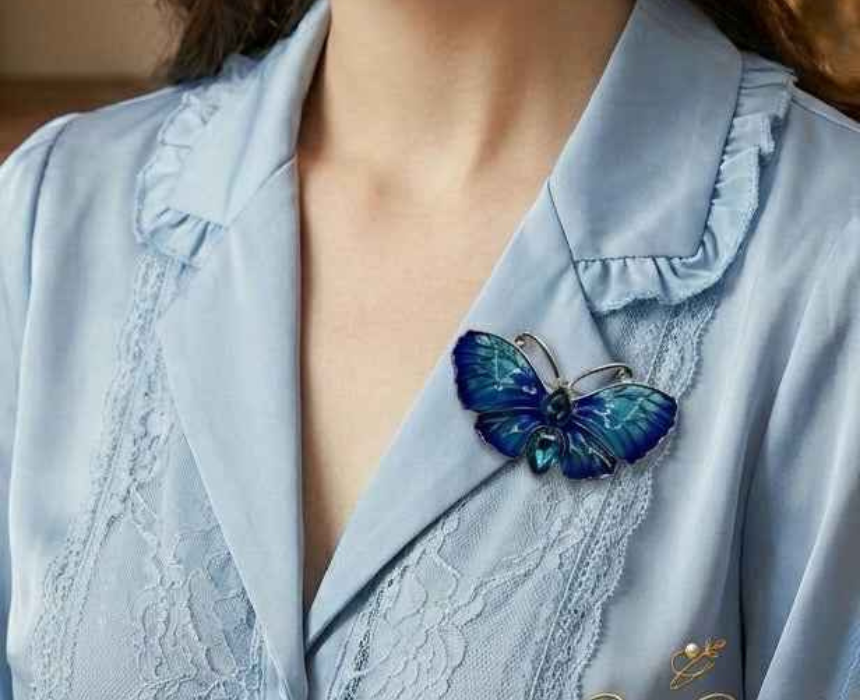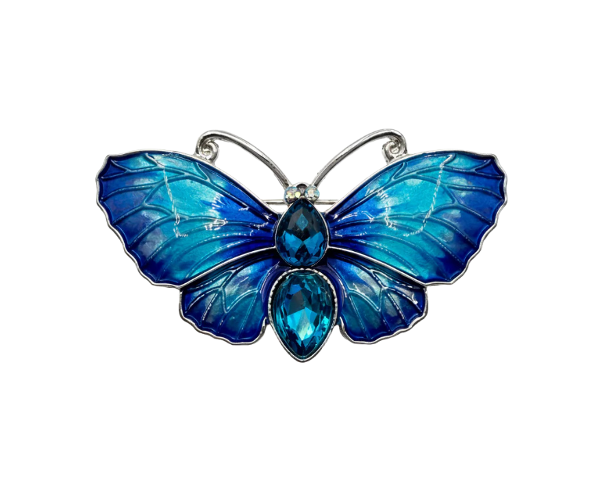 This vintage style blue enamel and crystal butterfly brooch features a delicate design with sparkling crystal accents and a secure pin backing for comfortable wear. Ideal for styling on jackets, blouses, scarves, or handbags, it adds a whimsical and elegant touch to both casual and formal outfits. Lightweight and versatile, it is perfect for personal accessorizing or as a thoughtful gift.