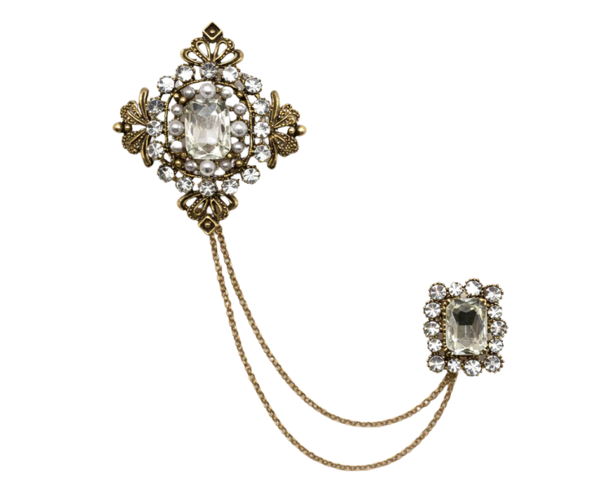 This vintage style clear crystal chatelaine collar brooch features a refined design with sparkling crystals and a secure pin backing for comfortable wear. Perfect for styling on collars, blouses, jackets, or scarves, it adds a touch of elegance and sophistication to both casual and formal outfits. Lightweight and versatile, it is ideal for personal accessorizing or thoughtful gifting.