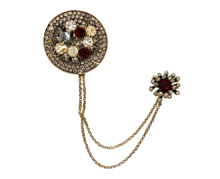 This vintage style brooch features an antique gold tone chatelaine design with sparkling crystals and delicate double collar chains for an elegant layered look. Crafted with intricate detailing, it attaches securely to collars, lapels, or garments, creating a refined statement piece. Perfect for adding a classic touch to both formal outfits and styled vintage inspired looks.