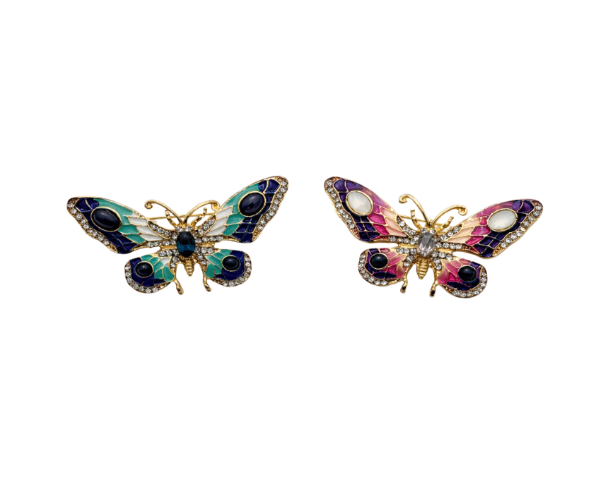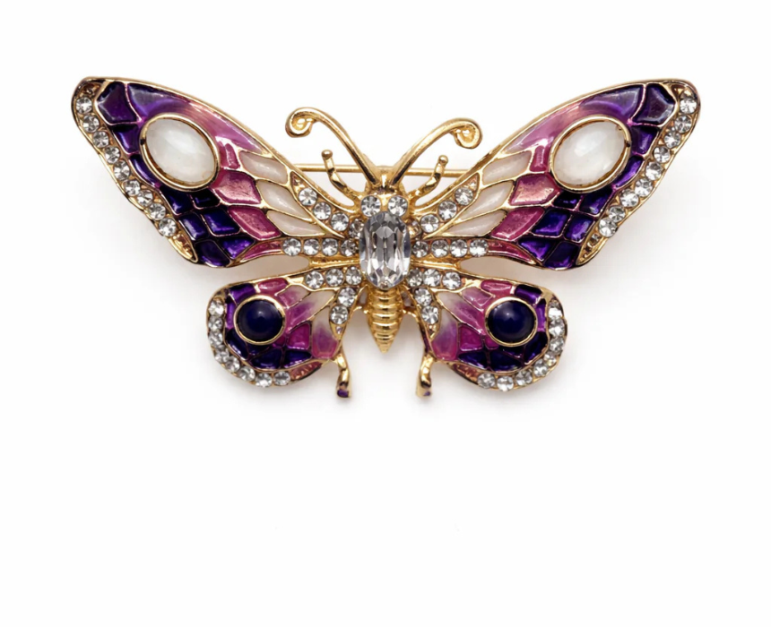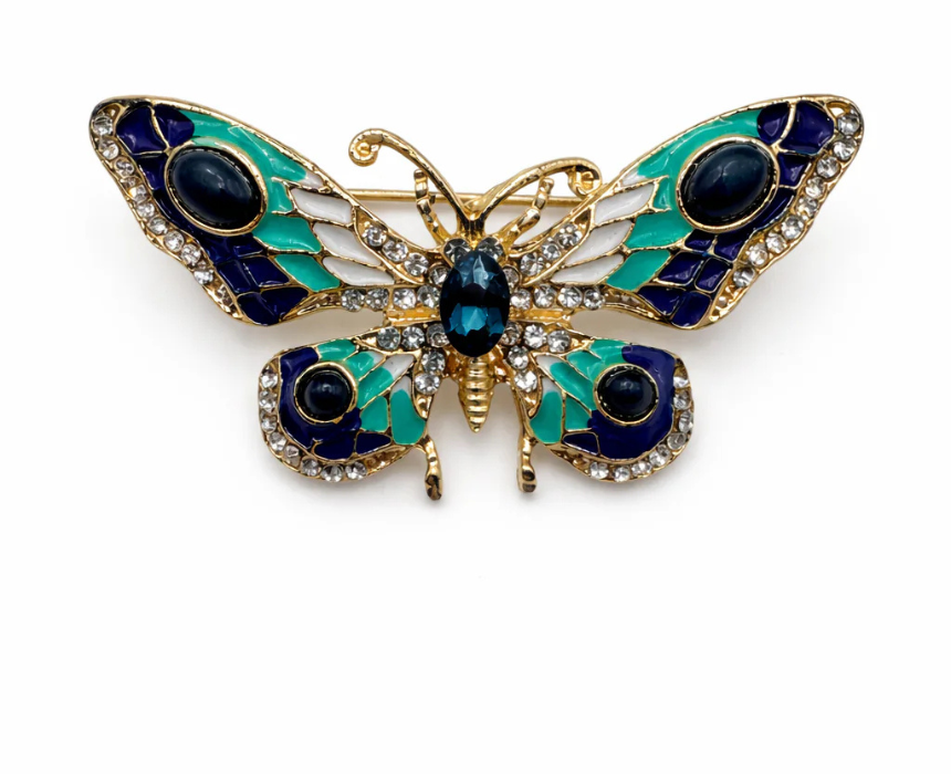 This brooch features a vintage style butterfly design crafted with enamel detailing and sparkling rhinestones for a classic and elegant look. Designed to add a refined statement, it can be styled on jackets, blazers, dresses, scarves, hats, or bags to enhance both casual and formal outfits with a touch of timeless charm and subtle shine.