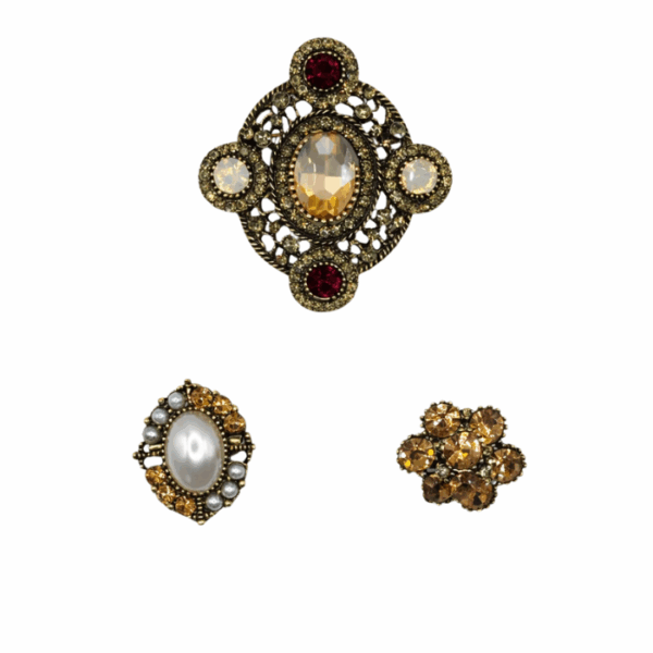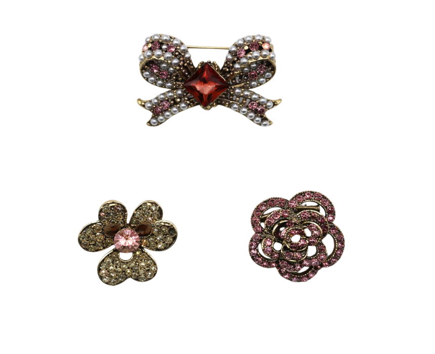 Add a touch of romantic, vintage charm to your wardrobe with our Vintage Style Mauve & Pearl Brooch Set. Sold together as a beautifully curated trio, these pieces are set in an antique gold-tone finish and can be worn individually for a subtle touch of elegance, or clustered together for a chic, maximalist statement.