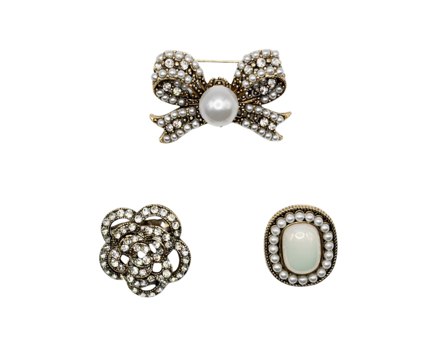 This vintage style brooch set of three features elegant pearl and crystal designs with secure pin backings for comfortable wear. Perfect for styling on jackets, dresses, scarves, or handbags, each piece adds a touch of sophistication and sparkle to both casual and formal outfits. Lightweight and versatile, the set is ideal for personal accessorizing or as a thoughtful gift.