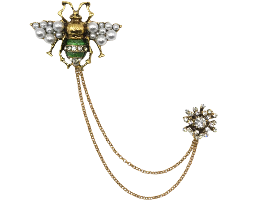 This vintage style pearl green bee chatelaine brooch features an intricate design with sparkling accents and a secure pin backing for comfortable wear. Perfect for styling on collars, blouses, jackets, or scarves, it adds a whimsical and elegant touch to both casual and formal outfits. Lightweight and versatile, it is ideal for personal accessorizing or as a thoughtful gift.