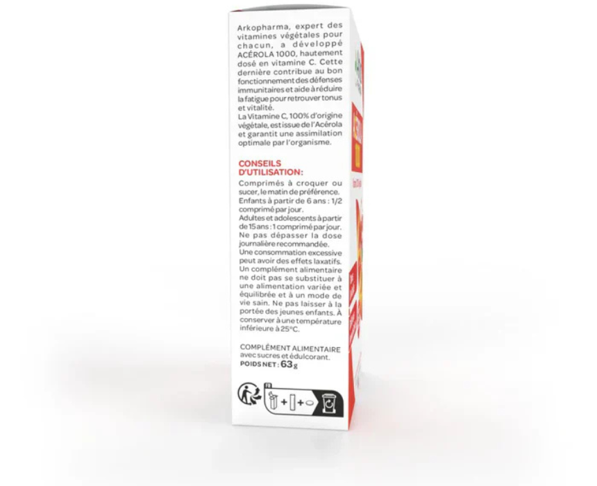 Acerola 1000 by Arkopharma delivers 100% plant based vitamin C sourced from acerola berries, known for their high natural potency and enhanced absorption. Free from artificial vitamin C, chemical dyes, and additives, it helps reduce fatigue and supports immune function for both adults and children. Take daily as part of a balanced routine, especially during seasonal changes or active periods.