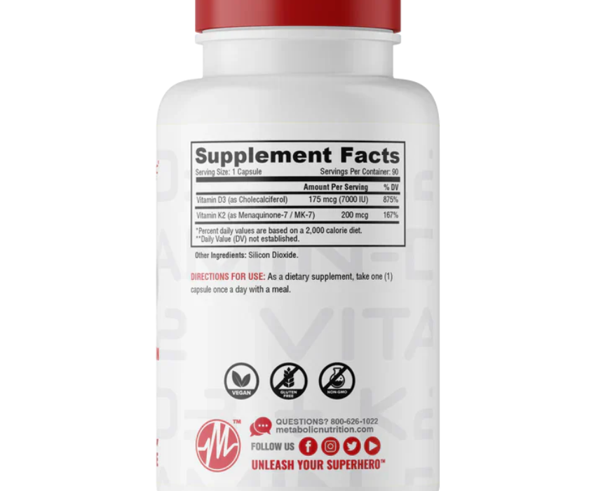 Metabolic Nutrition Vitamin D3 & K2 combines fat soluble Vitamin D3 with K2 to support strong and healthy bone development, improve calcium and phosphate absorption, and enhance overall wellness. This purified, all natural, highly concentrated formula also supports immune and cardiovascular health, brain function, muscle performance, and provides antioxidant protection. Take daily as directed to maximize health and vitality.