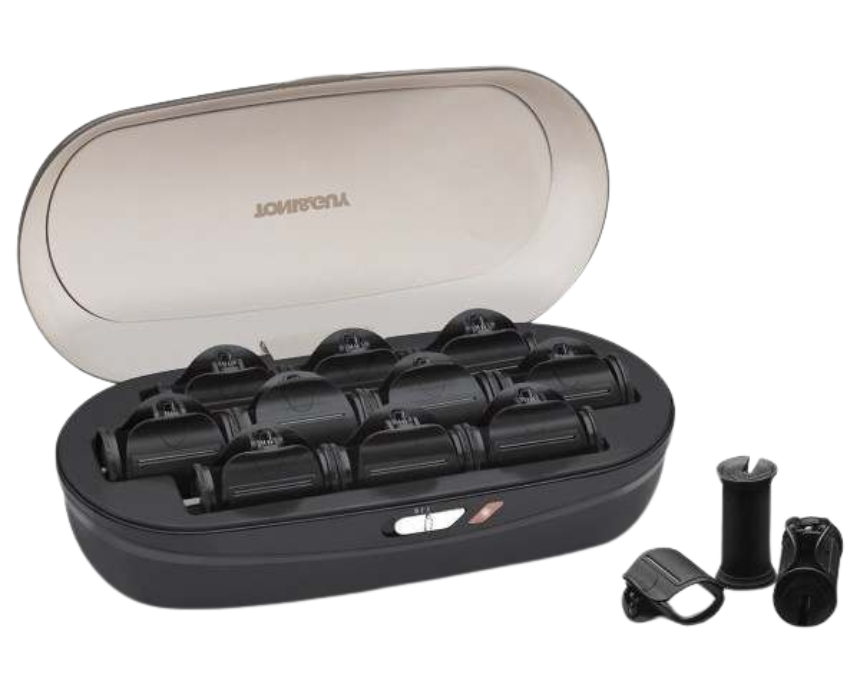 The TONI&GUY Professional Extreme Volume Rollers use Duo Heat Technology to deliver glamorous, voluminous curls while protecting hair with soft flocked barrels. The 10-piece set heats up in under two minutes and includes a heated storage case for convenient styling at home or on the go. Various barrel sizes allow customization for all hair types, giving high shine and conditioned curls effortlessly.