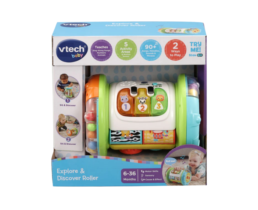 The VTech Explore and Discover Roller is an interactive grow with me activity toy for babies 6 to 36 months, designed to support learning through movement and music. Featuring light up learning keys, cheerful melodies, sing along songs, a drum button, and engaging elements like gears and rollers, it enhances hand eye coordination, motor skills, and sensory exploration. Perfect for sitting, crawling, pushing, and rolling stages, it delivers educational fun at every milestone.