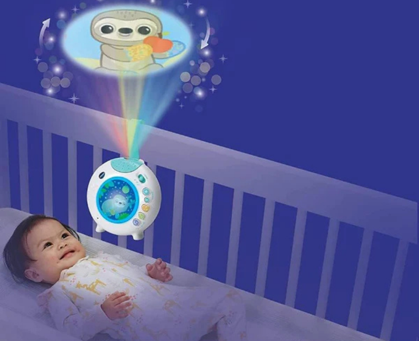 The VTech Sleepy Sloth Cot Light is a soothing bedtime companion for babies from birth, designed to help them relax and drift off peacefully. Featuring 3 lullabies, 40 melodies, nature sounds, adjustable light settings, a rotating ceiling pattern, and a built-in sound sensor that responds to crying, it creates a calming sensory experience. Securely attachable to the cot, it supports comforting routines while promoting restful sleep for little ones.