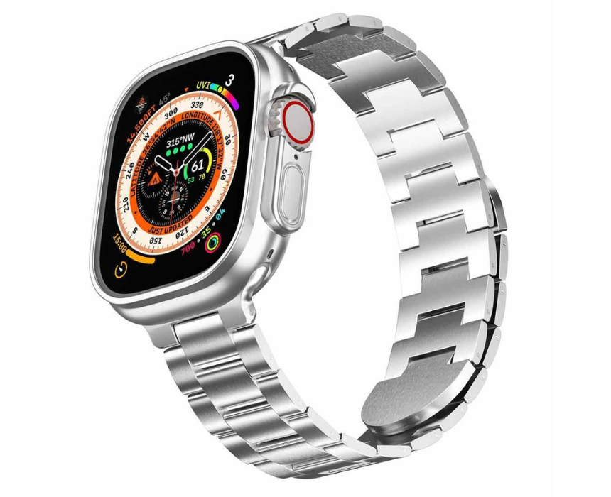 The Acero Watch Band GNACORWBSL in silver fits 42, 44, 45, and 49mm watches, offering a durable stainless steel design with a polished finish for a sophisticated look. Its sleek silver tone pairs effortlessly with office attire, casual outfits, or formal wear, providing a stylish and comfortable upgrade for any smartwatch.