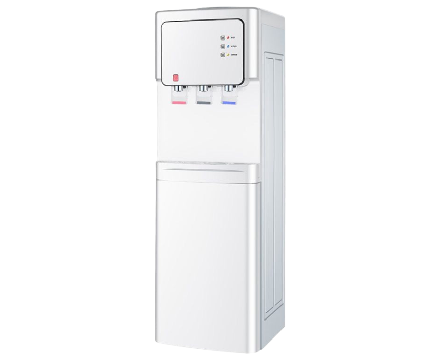 This touchless hot and cold water dispenser features a slim, modern design with three taps for hot, cold, and room-temperature water. Its stainless steel inner tank, child safety lock, built-in storage cabinet, and efficient heating and cooling systems ensure safe and convenient use at home or office. Available in white and black, it combines style, functionality, and safety in a compact 33×34×98 cm unit.