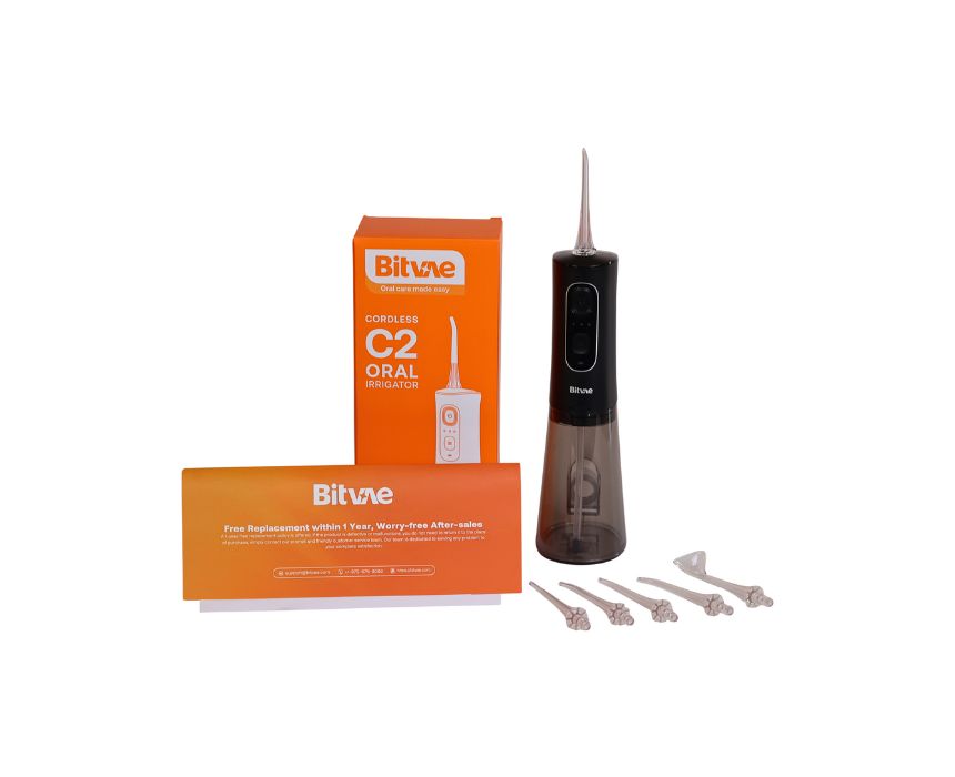 The Bitvae C2 Water Flosser is a cordless oral irrigator featuring 3 effective cleaning modes and a 40-day battery life for hassle-free dental care. It includes 5 nozzles to suit various needs and is available in sleek black or clean white. Ideal for home or travel use, simply fill the tank, choose your preferred mode, and guide the nozzle along the gumline and between teeth for a fresh, thorough clean.