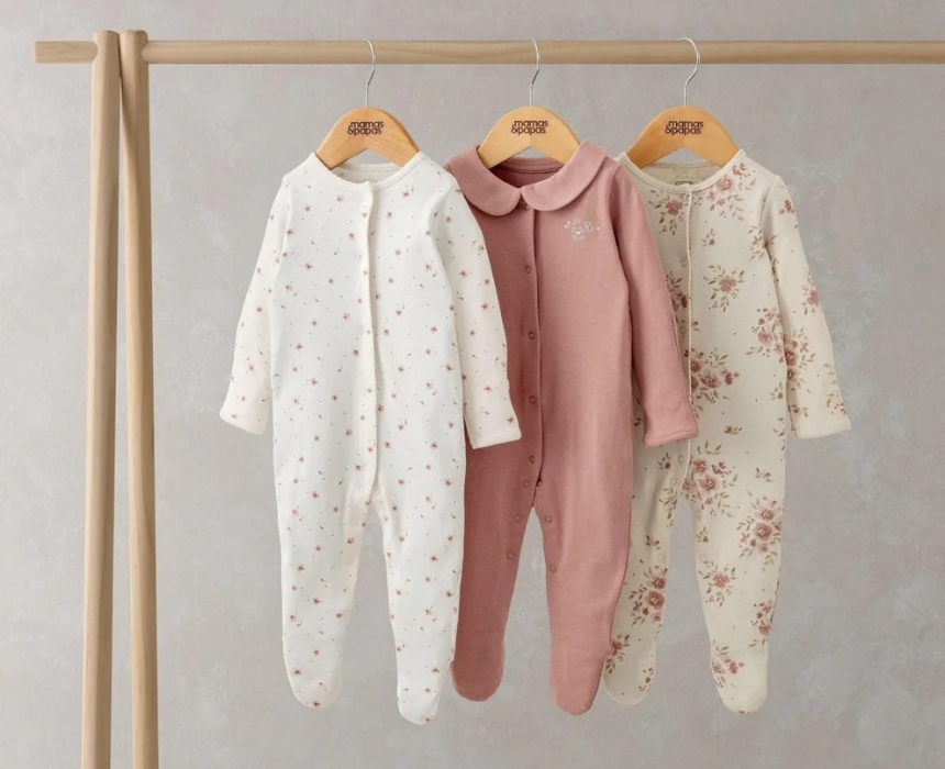 The Watercolour Floral Sleepsuits Pack of 3 features soft, breathable 100% cotton sleepsuits designed for comfort and everyday wear. This handy set includes one watercolour floral print, one plain dusted peony sleepsuit with floral placement print, and one ditsy floral print, making it perfect for easy outfit changes. Ideal for sleep or lounging, these sleepsuits can be worn alone or layered with a cardigan for cooler days.