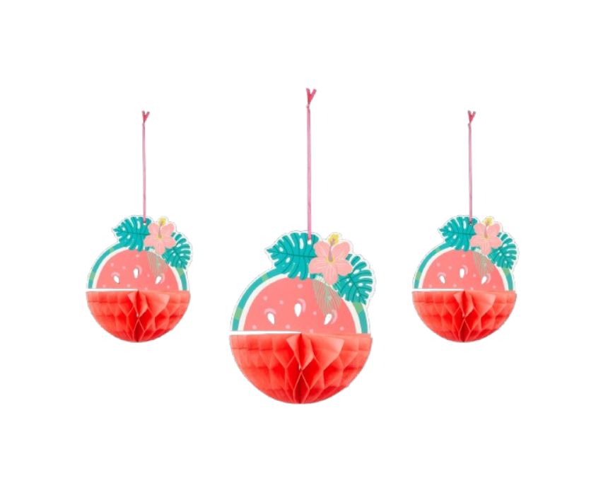 The Watermelon Paper Honeycomb Decoration set includes 3 pieces: 1 pcs (30cm) and 2 pcs (20cm). Perfect for adding a fun, fruity touch to summer parties, picnics, or tropical-themed events, these vibrant watermelon decorations create a refreshing atmosphere. Hang them as colorful accents, pair them with other fruit-themed decor, or use them for a playful, eye-catching style. Easy to assemble and lightweight, they bring a cheerful vibe to any celebration.