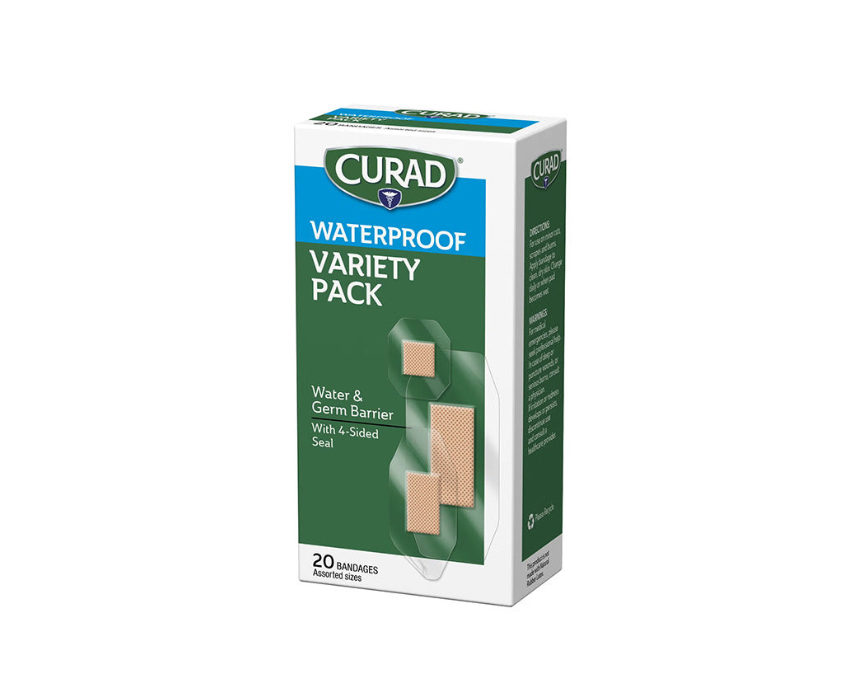 A set of waterproof adhesive bandages in assorted sizes designed to provide reliable protection for minor cuts, scrapes, and wounds. They offer a strong hold that resists water and moisture, helping keep the affected area clean and covered during daily activities. Apply to clean, dry skin as part of a basic first aid routine for safe and hygienic care.