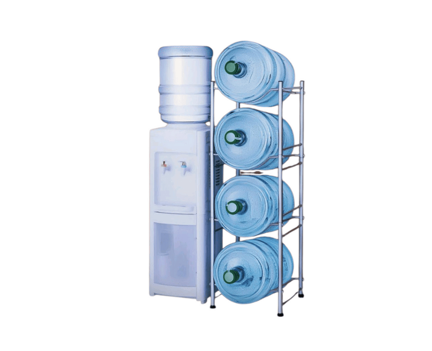 Sturdy metal water bottle rack with 3 or 4 shelves, perfect for storing heavy bottles while saving floor space in your kitchen or office. Durable and space-saving design keeps your area organized.