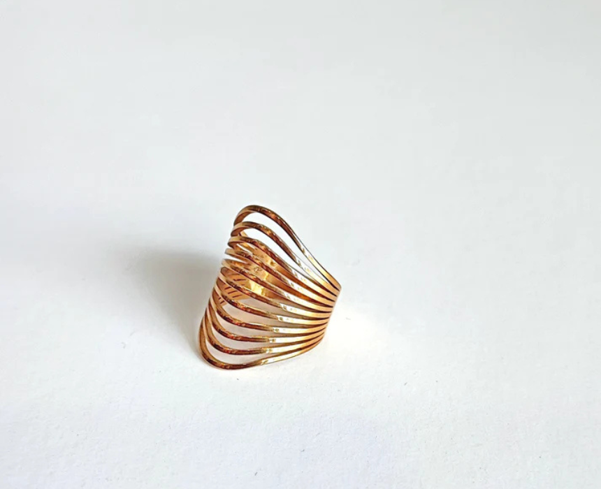 The Waves of Gold Ring is crafted from 18K Gold Plated Stainless Steel and features a unique wave-inspired design, water resistant for everyday wear, perfect for adding a touch of elegance to any outfit, can be stacked with other rings or worn alone as a statement piece.