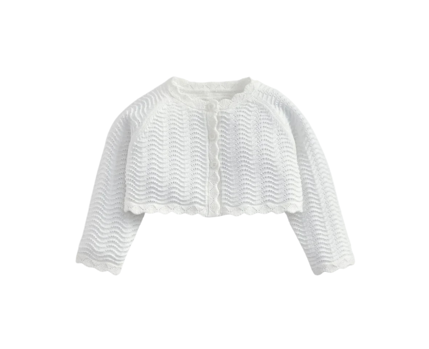 The Wavy Stitch Bolero Cardigan is a charming layer for little ones, featuring a delicate scallop-edge trim on the cuffs, hem, and front. Designed with raglan armholes and a three-button fastening at the front, it offers comfort and ease of wear. Perfect for pairing over dresses, tops, or festive outfits, it adds a polished and stylish finishing touch.