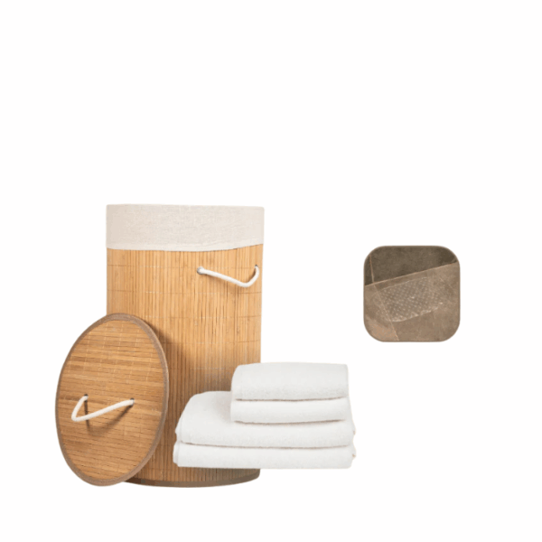 The White Bathroom Essentials Bundle includes a bamboo laundry basket, soft white towels, a modern bathroom accessories set with wood accents, and a transparent anti-slip mat for complete everyday convenience. Designed to blend style and practicality, this coordinated bundle enhances any modern or minimalist bathroom while keeping it organized and visually clean.