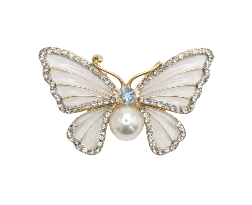 This brooch features a delicate butterfly design in white enamel adorned with pearls and crystal accents set in a gold tone finish, creating an elegant bridal inspired accessory. Crafted with refined detailing, it can be styled on dresses, blazers, scarves, or bags to add a graceful and luminous touch suitable for weddings, formal events, and special occasions.