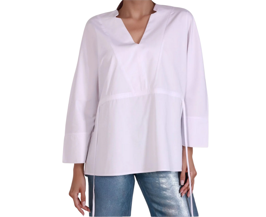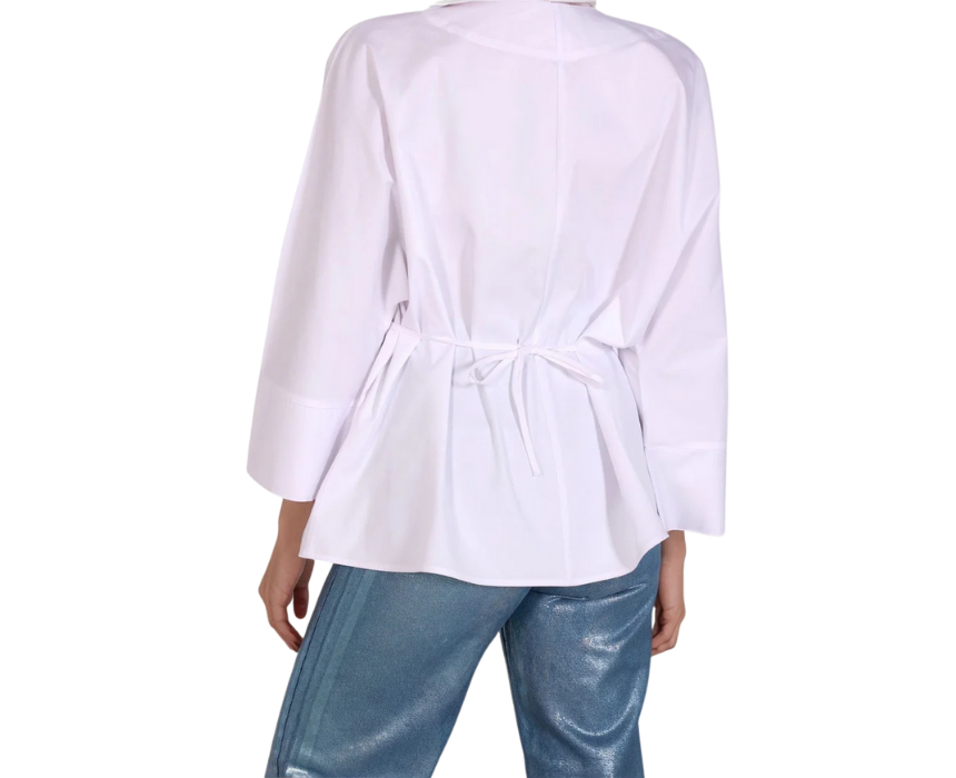 The White Epitome Shirt combines a classic white design with a modern adjustable waist, offering a relaxed and comfortable fit. The waist tie allows styling loose or cinched, perfect for pairing with trousers, jeans, or skirts for versatile looks. Made from cotton, polyester, and lycra, fabric care includes machine wash at 30°C, professional dry clean, medium-heat ironing, no bleaching, and do not tumble dry.