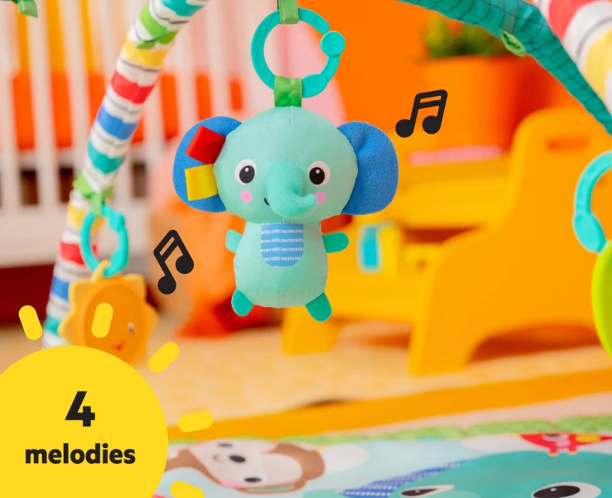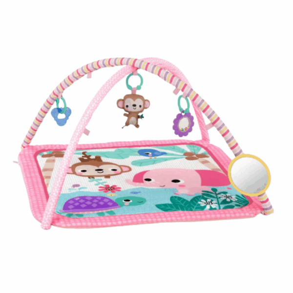 The baby activity gym provides a jungle-themed play space designed for tummy time, lay and play, and early sensory exploration. It includes a foldable toy bar with 5 detachable toys such as a musical elephant, mirror, rattles, and textured play elements to support motor skill development and engagement. The soft machine-washable mat and compact folding design make it practical for everyday use and easy storage while growing with the baby from infancy.