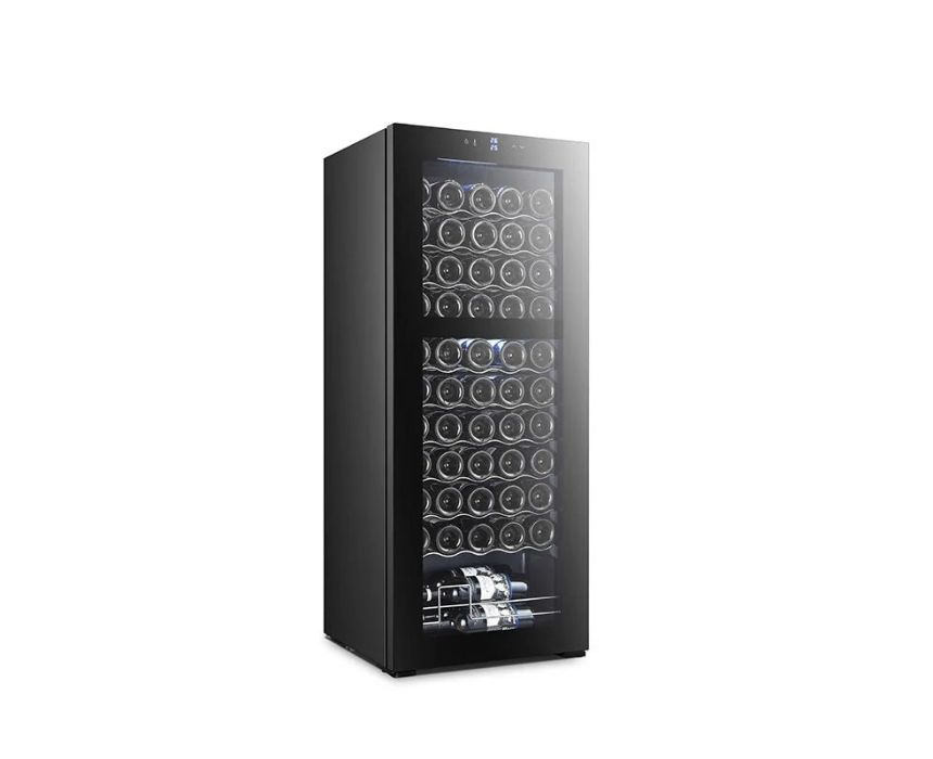 The Dual Zone Wine Cellar stores up to 55 bottles with two temperature zones—20 bottles in the upper zone and 35 in the bottom—ranging from 5–18°C. Featuring a compressor fan cooling system, touch-screen control panel with lock, LED temperature display, tempered glass door, interior LED light, and 9 wooden shelves, it combines style with functionality. Additional features include a wired rack, auto defrost, and energy-efficient 85W power consumption.