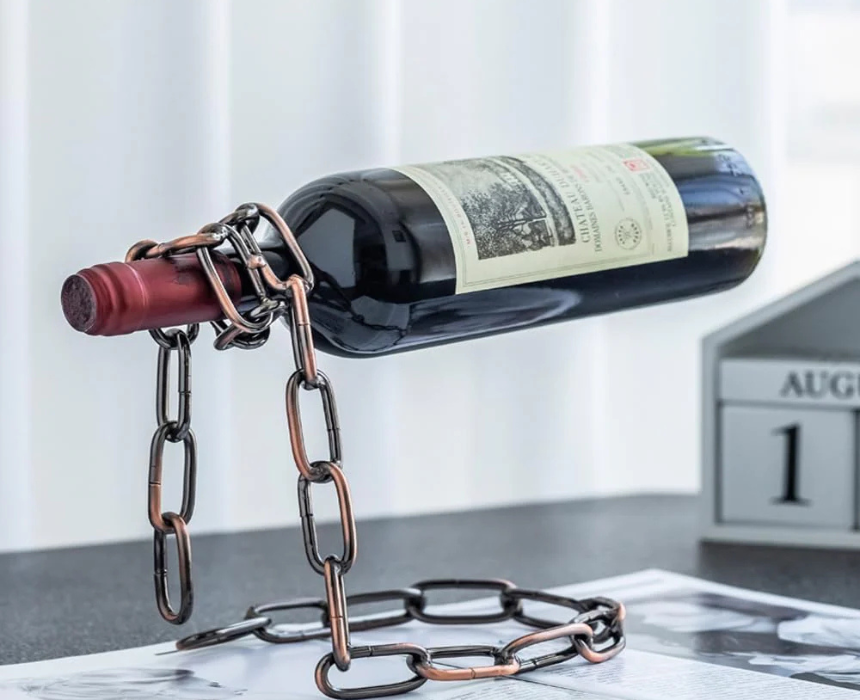 The wine holder metal chain home décor piece features a creative floating design that uses a sturdy linked chain to securely display a single wine bottle with artistic flair. Its eye-catching style enhances bars, kitchens, and dining areas; simply place it on a flat surface to showcase wine bottles as a unique decorative accent.