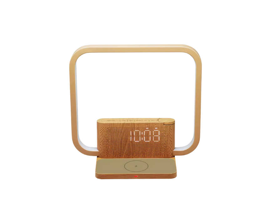 This multifunctional wireless charger lamp combines a 10W wireless charging pad, dimmable 4000K LED light with three brightness levels, white noise machine with 10 soothing sounds, dual alarm clock, LCD display, and a smart wake-up light mode in one compact design. Featuring a detachable base for easy placement, it is ideal for bedrooms, offices, or nightstands, adding both function and modern style while supporting better sleep and organized charging.
