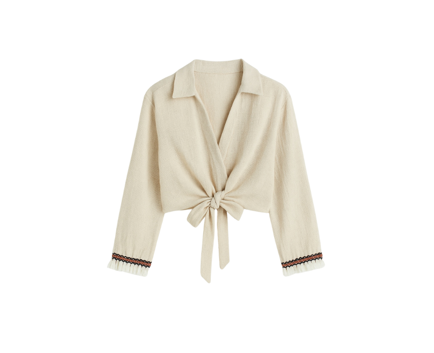 Soft, lightweight beige blouse with a flattering tie-front waist and relaxed sleeves featuring embroidered fringe cuffs. Perfect for pairing with high-waisted pants or skirts for an effortless chic look. Free Size.