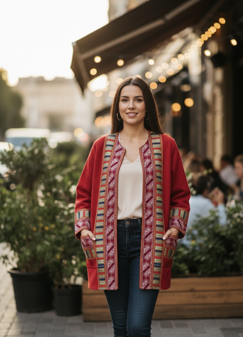 This women’s wool jacket is crafted from premium “Joukh” wool, combining warmth and durability with intricate hand-embroidered geometric patterns and vibrant woven bands. Featuring a structured, open-front design, it serves as a versatile statement piece for layering over casual or sophisticated outfits. Perfect for those who appreciate artisanal craftsmanship, cultural heritage, and timeless slow-fashion style.