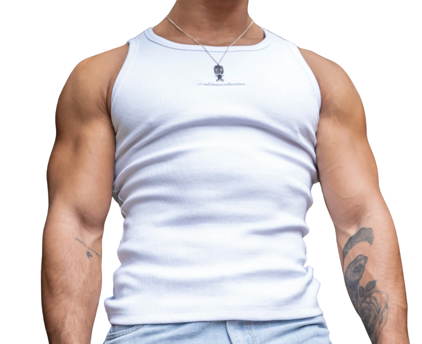 The XX Premium Tank Top by doublexxcollection is crafted from high-end 2 by 2 premium fabric, offering a slim, body-hugging fit for a sleek silhouette. Designed in clean white, it features minimalist mid-chest embroidery for a refined and modern look. Perfect for pairing with jeans, shorts, or joggers, this tank top delivers effortless style for workouts or casual streetwear outfits.