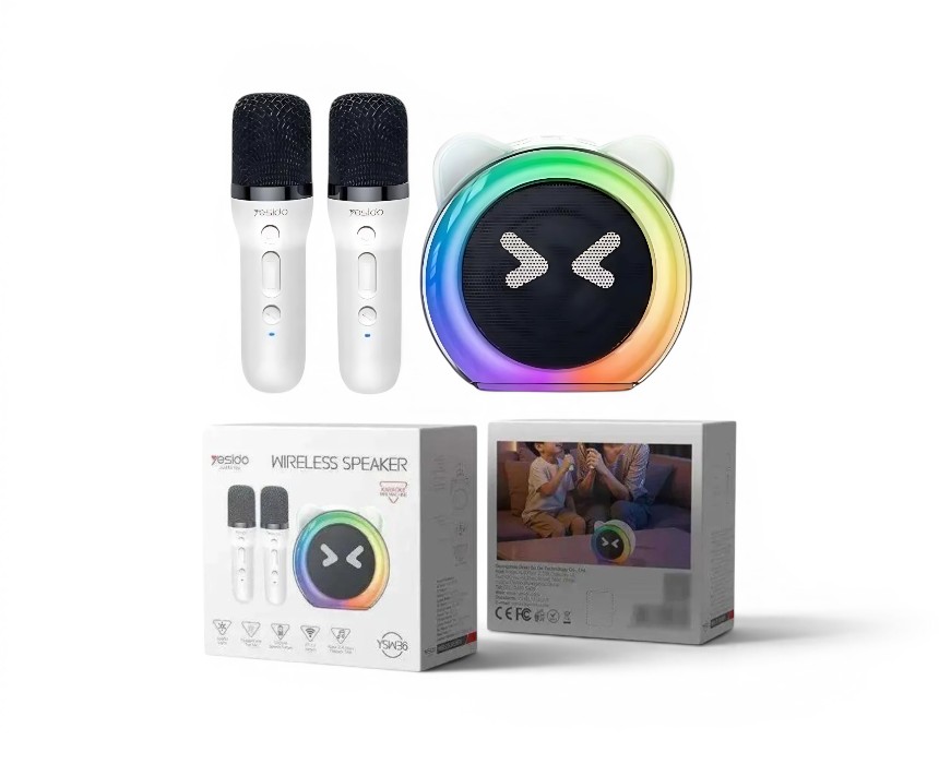 Bring the party anywhere with this Yesido mini karaoke machine. This Bluetooth 5.3 wireless speaker delivers crisp, clear sound and features vibrant, colorful LED lights to set the mood. It comes equipped with two wireless microphones, making it perfect for duets, family entertainment, or small parties. With a Type-C charging port and up to 4 hours of playback time, this compact set is designed for fun on the move. High-quality audio meets effortless entertainment.