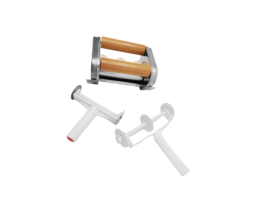 <p>This two piece stainless steel pasta set includes a small and big pasta maker, each with a wooden handle for easy rolling. It comes with a wooden roller and a ravioli mold, making it ideal for preparing fresh homemade pasta and ravioli with precision and convenience.</p>