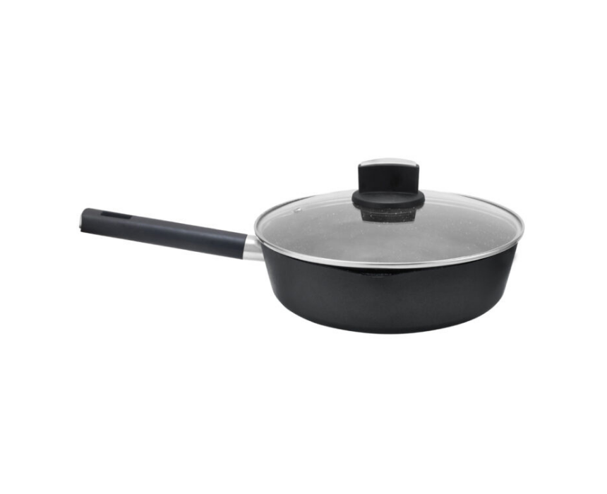 <p>This 24 cm frying pan comes with a soft touch handle and knob, an induction compatible bottom, and a non stick marble coating for healthy cooking. It includes a glass lid for convenient monitoring while cooking, making it perfect for everyday kitchen use.</p>