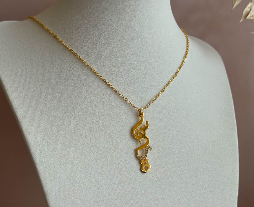 A personalized jewelry piece featuring an Arabic initial highlighted with sparkling zircon stones for an elegant and refined look. This stylish accessory adds a meaningful touch to everyday outfits while offering a subtle hint of brilliance. It can be worn alone for a minimalist statement or layered with other necklaces to create a modern personalized style